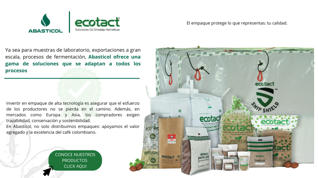 Abasticol es representante exclusivo en Colombia de Ecotact, una marca presente en más de 70 países que ha revolucionado el empaque para cafés y cacaos especiales. Sus empaques ofrecen hasta 9 capas de protección, manteniendo la frescura, aroma y estructura del grano durante más de un año.