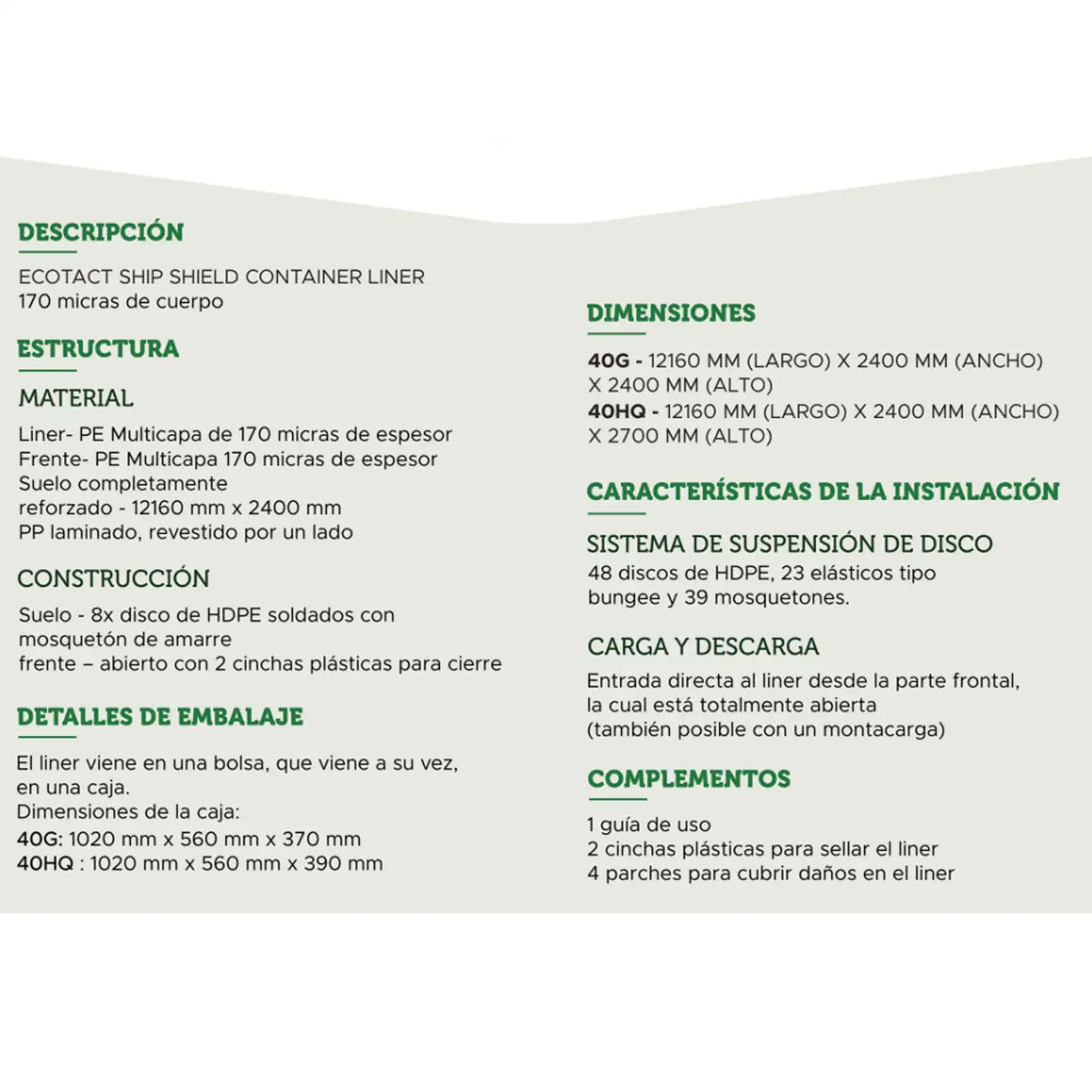 - Capacidad Óptima: Cada bolsa Ecotact para contenedor 40 Ft está diseñada para hermetizar un contenedor de 40 pies, lo que las hace ideales para el transporte de grandes cantidades de cafe, siendo una perfecta solución tanto para importadores como exportadores.